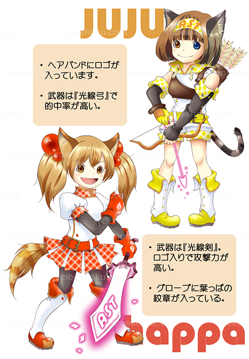 ■じゅじゅ...少々ビビりな彼女は後方から光線弓で敵を攻撃。イメージカラーはロゴの色から黄色。